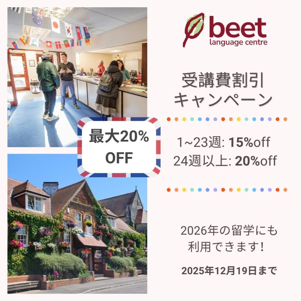 今日は、ビートランゲージセンターから届いた最新ニュースをご紹介します。 イギリス留学を検討中の方には見逃せないお得情報です。