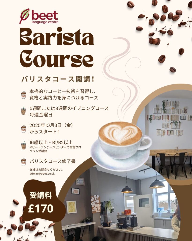 さらに嬉しいニュースです。 地元のカフェと提携し、新しく 「バリスタ養成コース」 が開講されます。 YMSでのカフェ勤務や英語環境での実践スキル習得にも役立つプログラムです。